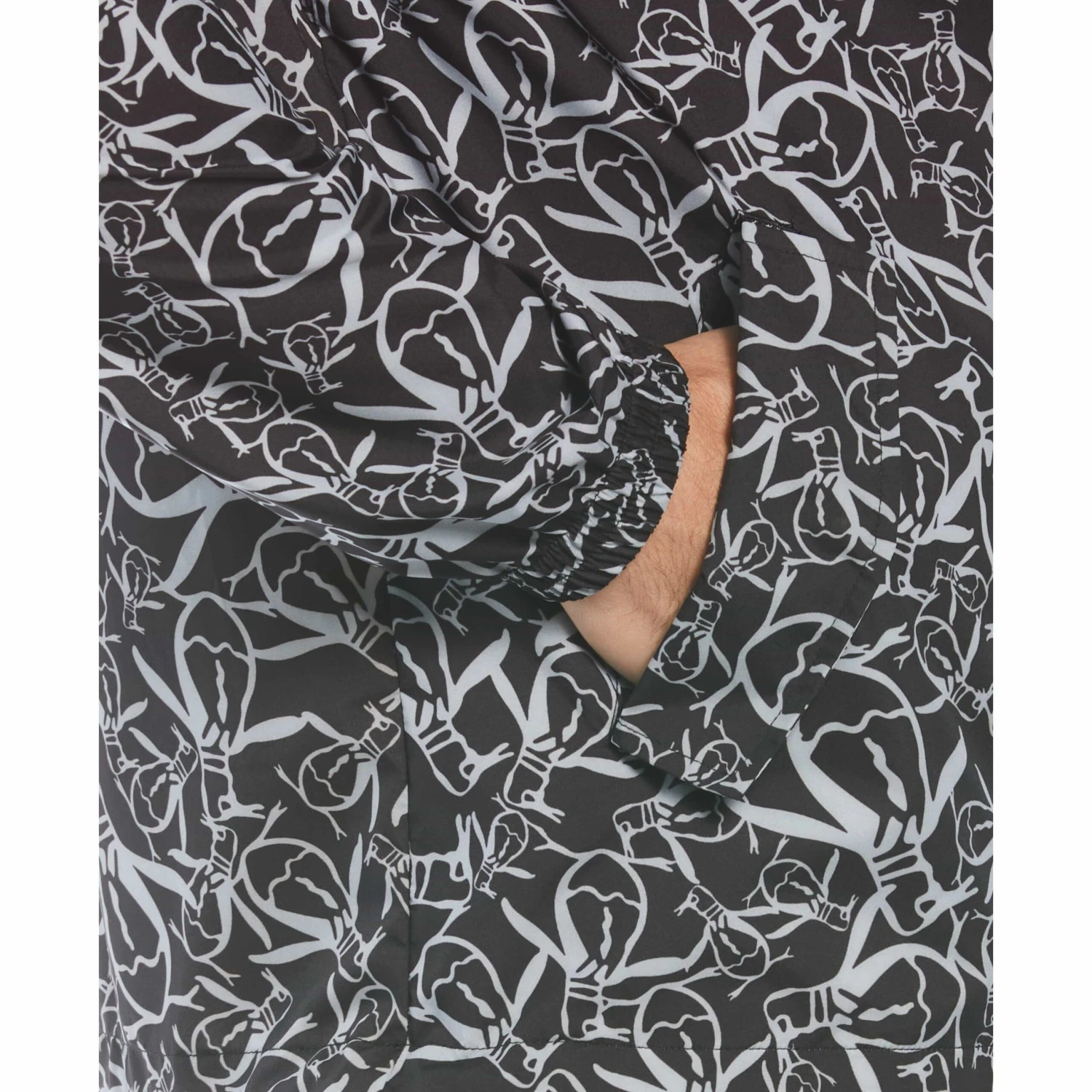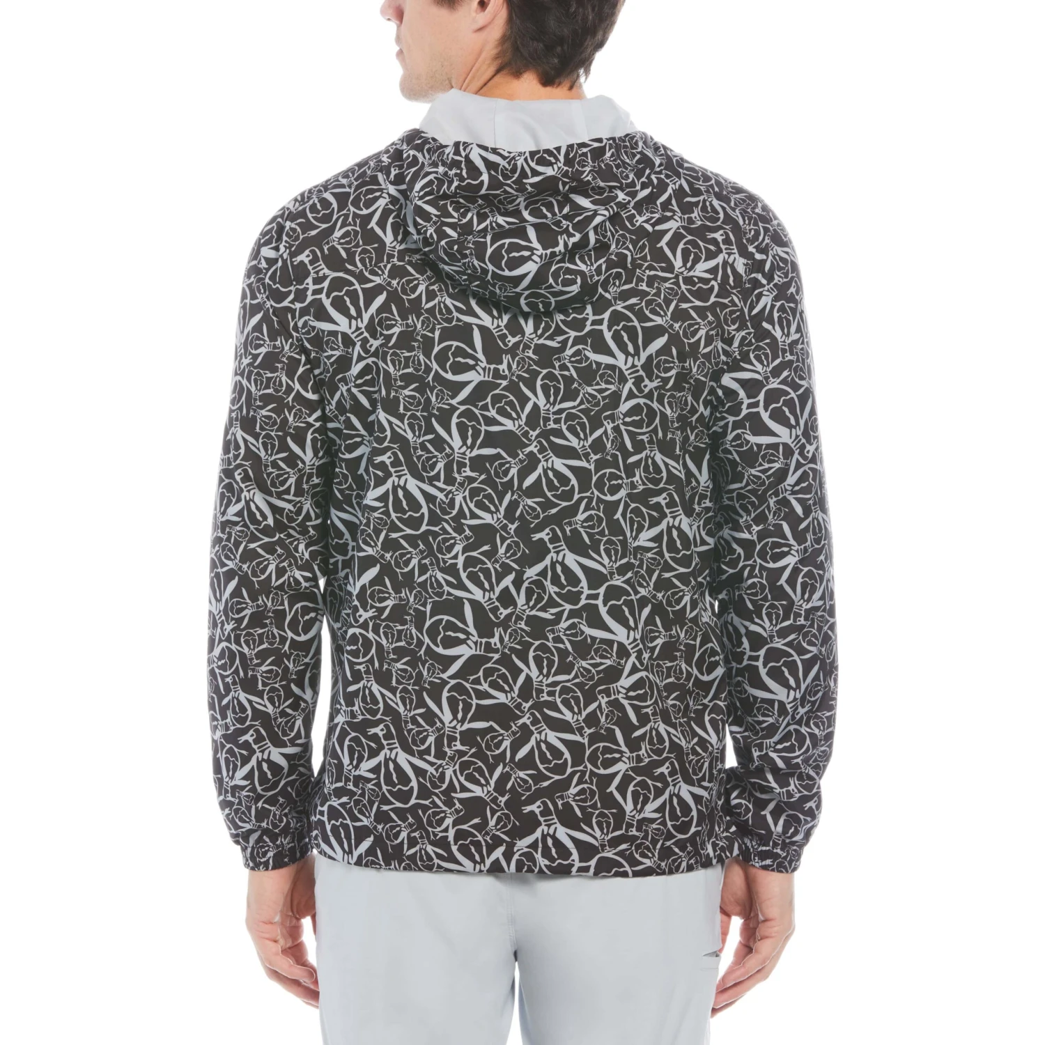 This Original Penguin men’s lightweight jacket helps you stay stylish and protected when outdoors. Designed with both fashion and functionality in mind, this men’s jacket features a hooded collar and long sleeves for protection from the elements. Crafted with stretch poplin fabrication, this men’s windbreaker ensures a comfortable and flexible fit that’s just right for all-day wear. The unique penguin print pattern adds a touch of whimsy to your wardrobe.